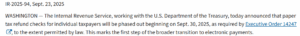 Department of Treasury issued a statement last spring that they would no longer accept or issue paper checks as of 9/30/2025 (see above). This includes the IRS. Usually the IRS moves much slower and more deliberately in making changes like this but at this point they have not said they are NOT abiding by that pronouncement.